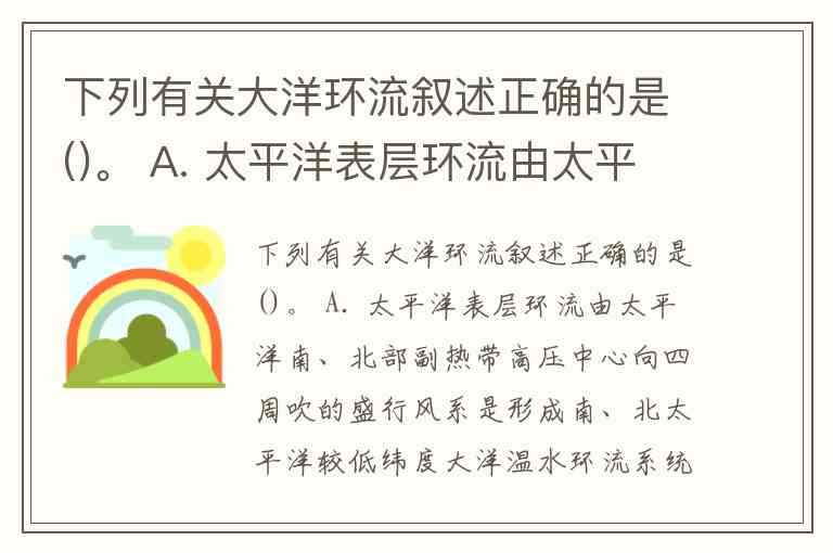 下列有关大洋环流叙述正确的是()。 A. 太平洋表层环流由太平洋南、北部副热带高压中心向四周吹的盛行风系是形成南、北太平洋较低纬度大洋温水环流系统的主要因素。 B. 北太平洋副热带高压中心的四周洋流呈顺时针方向流 C. 北太平洋较高纬度地区常年受北太平洋副极地低压中心控制,由四周吹向低压中心的风系呈逆时针方向运行 D. 本格拉寒流在10°S附近与南赤道暖流首尾相接,形成了南大西洋的逆时针环流系统。