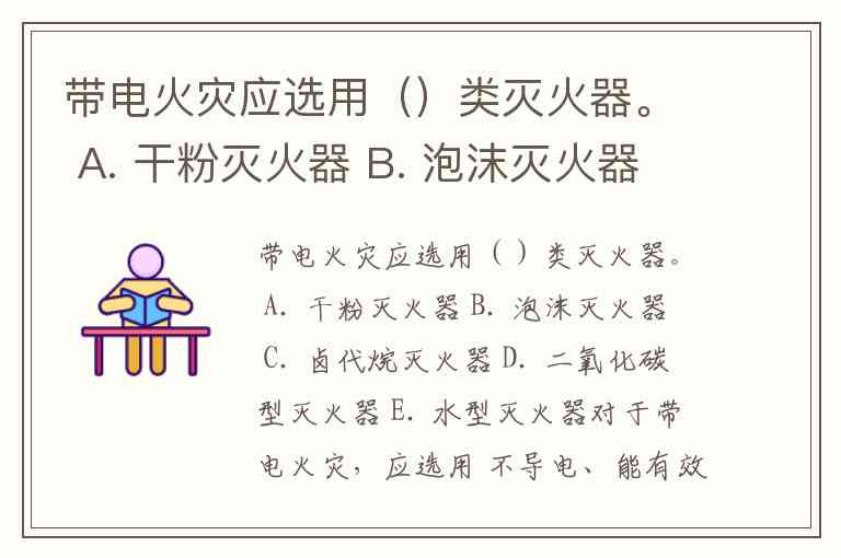 对于带电火灾,应选用 不导电、能有效扑灭电气火灾且不会损坏设备的灭火器。