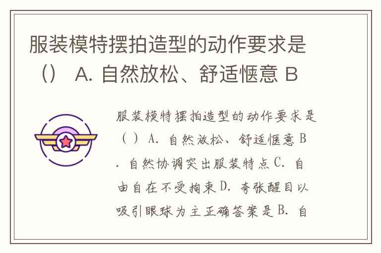 服装模特摆拍造型的动作要求是() A. 自然放松、舒适惬意 B. 自然协调突出服装特点 C. 自由自在不受拘束 D. 夸张醒目以吸引眼球为主