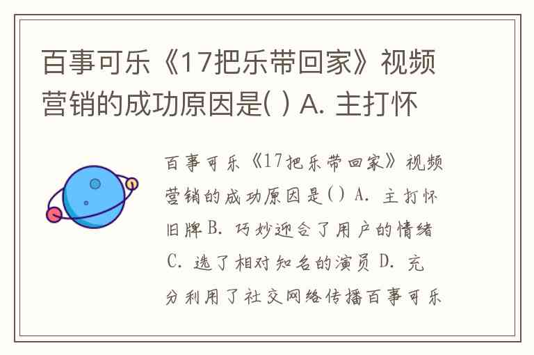 百事可乐《17把乐带回家》视频营销的成功原因是( ) A. 主打怀旧牌 B. 巧妙迎合了用户的情绪 C. 选了相对知名的演员 D. 充分利用了社交网络传播