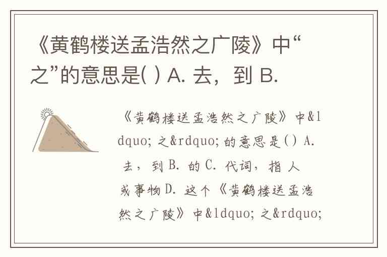 《黄鹤楼送孟浩然之广陵》中“之”的意思是( ) A. 去,到 B. 的 C. 代词,指 人或事物 D. 这个