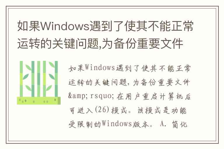 如果Windows遇到了使其不能正常运转的关键问题,为备份重要文件’在用户重启计算机后可进入(26)模式。该模式是功能受限制的Windows版本。 A. 简化 B. 安全 C. 测试 D. 诊断