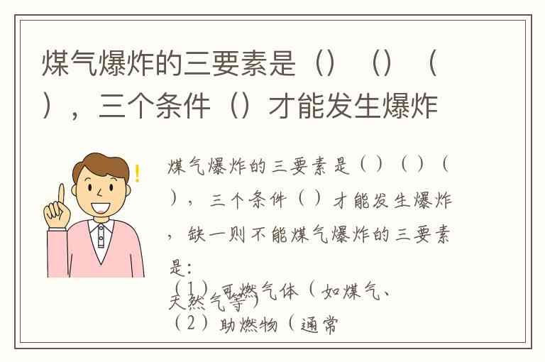 煤气爆炸的三要素是:(1)可燃气体(如煤气、天然气等)(2)助燃物(通常为氧气,空气中的氧气即可)(3)点火源(明火、电火花、高温表面等)