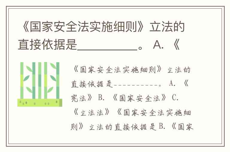 《国家安全法实施细则》立法的直接依据是__________。 A. 《宪法》 B. 《国家安全法》 C. 《立法法》