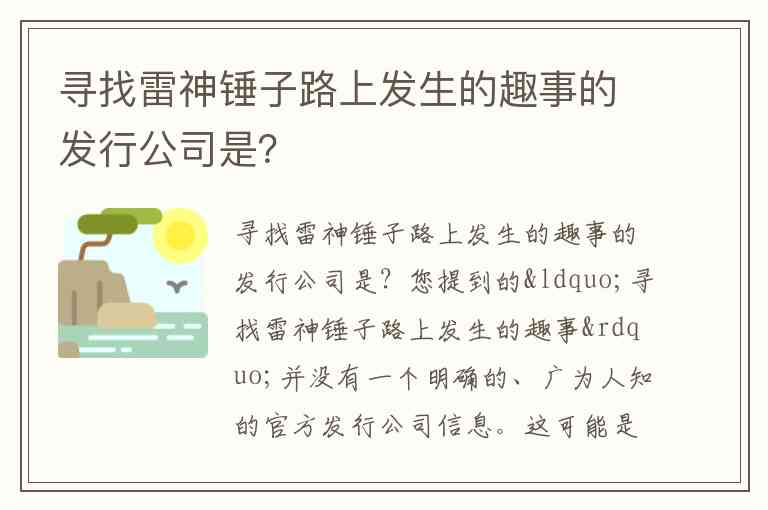 您提到的“寻找雷神锤子路上发生的趣事”并没有一个明确的、广为人知的官方发行公司信息。这可能是因为: