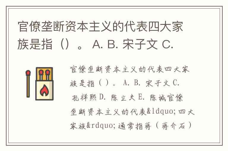 官僚垄断资本主义的代表“四大家族”通常指蒋(蒋介石)、宋(宋子文)、孔(孔祥熙)、陈(陈果夫、陈立夫)四大家族。