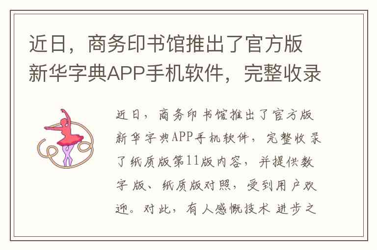 商务印书馆推出官方版《新华字典》APP,内容完整收录纸质版,提供数字版、纸质版对照,用户欢迎。