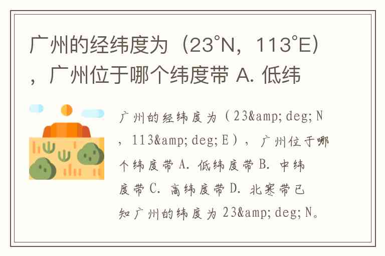 广州的经纬度为(23°N,113°E),广州位于哪个纬度带 A. 低纬度带 B. 中纬度带 C. 高纬度带 D. 北寒带