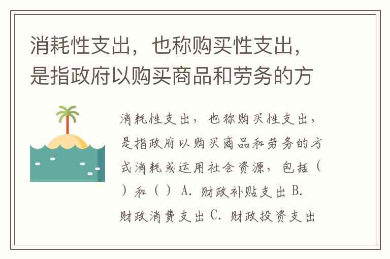 消耗性支出,也称购买性支出,是指政府以购买商品和劳务的方式消耗或运用社会资源,包括 财政消费支出 和 财政投资支出。
