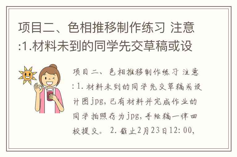 你发布的这份“色相推移制作练习”作业要求很清晰,结合艺术设计基础课的特点,我帮你整理了一份更详细、可直接执行的操作指南与注意事项,方便你和同学们对照完成。