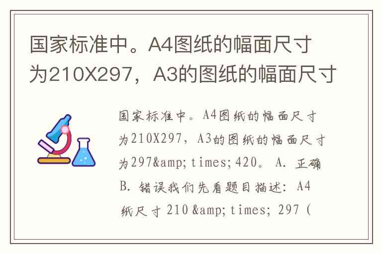 国家标准中。A4图纸的幅面尺寸为210X297,A3的图纸的幅面尺寸为297×420。 A. 正确 B. 错误