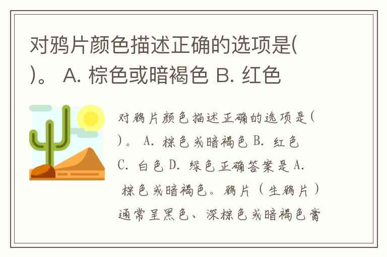 对鸦片颜色描述正确的选项是( )。 A. 棕色或暗褐色 B. 红色 C. 白色 D. 绿色