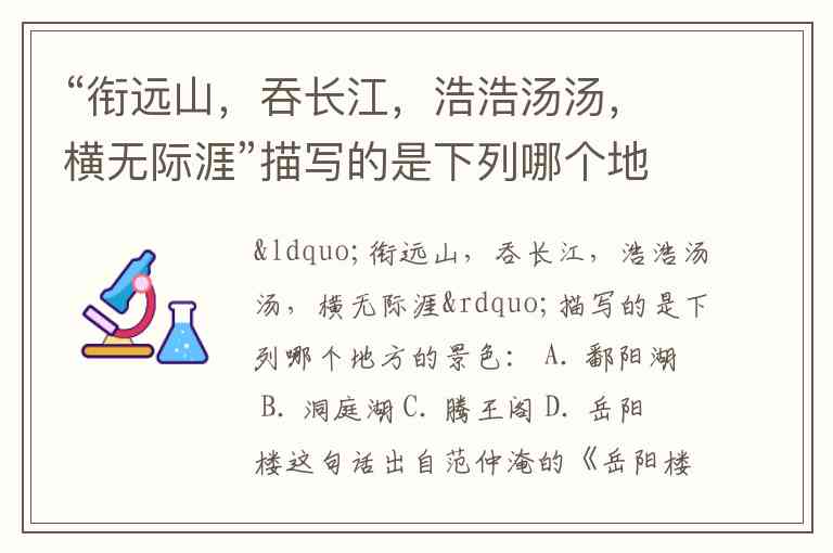 “衔远山,吞长江,浩浩汤汤,横无际涯”描写的是下列哪个地方的景色: A. 鄱阳湖 B. 洞庭湖 C. 腾王阁 D. 岳阳楼
