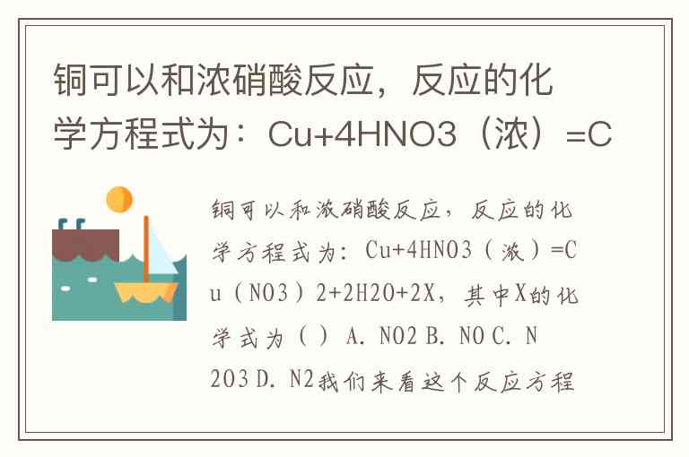 铜可以和浓硝酸反应,反应的化学方程式为:Cu+4HNO3(浓)=Cu(NO3)2+2H2O+2X,其中X的化学式为() A. NO2 B. NO C. N2O3 D. N2