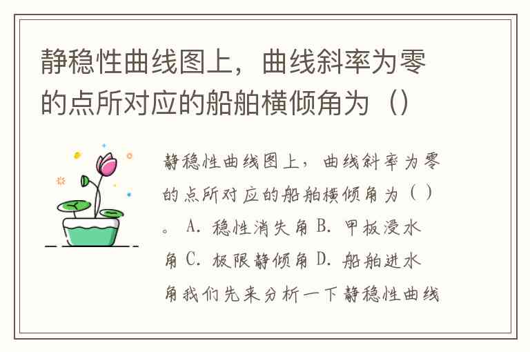 静稳性曲线图上,曲线斜率为零的点所对应的船舶横倾角为()。 A. 稳性消失角 B. 甲板浸水角 C. 极限静倾角 D. 船舶进水角