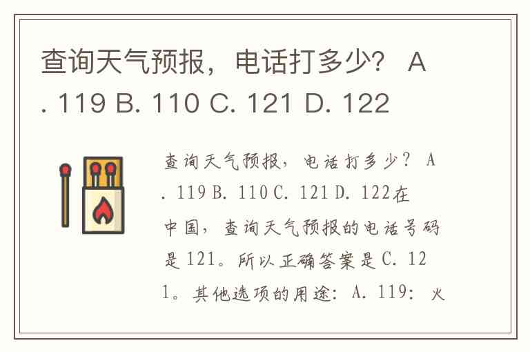 查询天气预报,电话打多少? A. 119 B. 110 C. 121 D. 122
