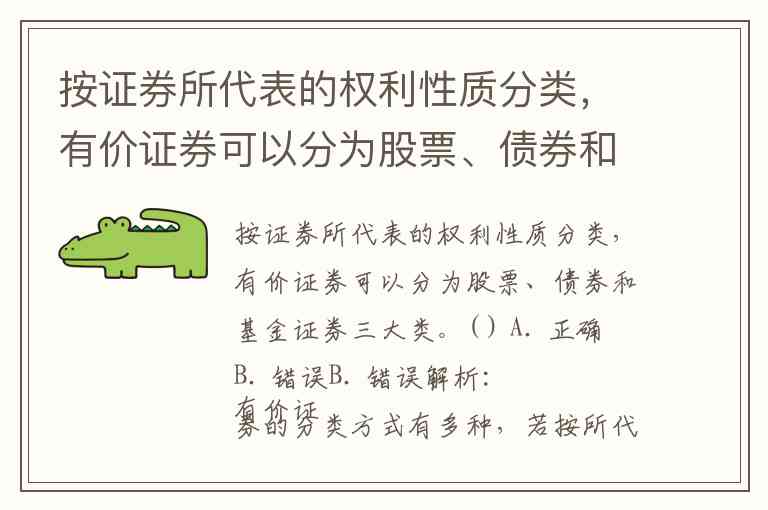 若按发行主体或交易方式等分类,基金证券可能单独列出,但题干明确是“按所代表的权利性质”,因此该说法不准确。