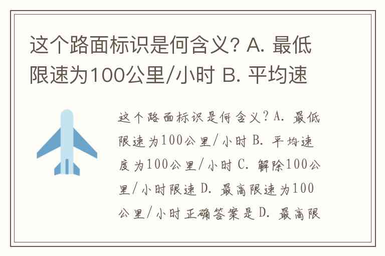 这个路面标识是何含义? A. 最低限速为100公里/小时 B. 平均速度为100公里/小时 C. 解除100公里/小时限速 D. 最高限速为100公里/小时