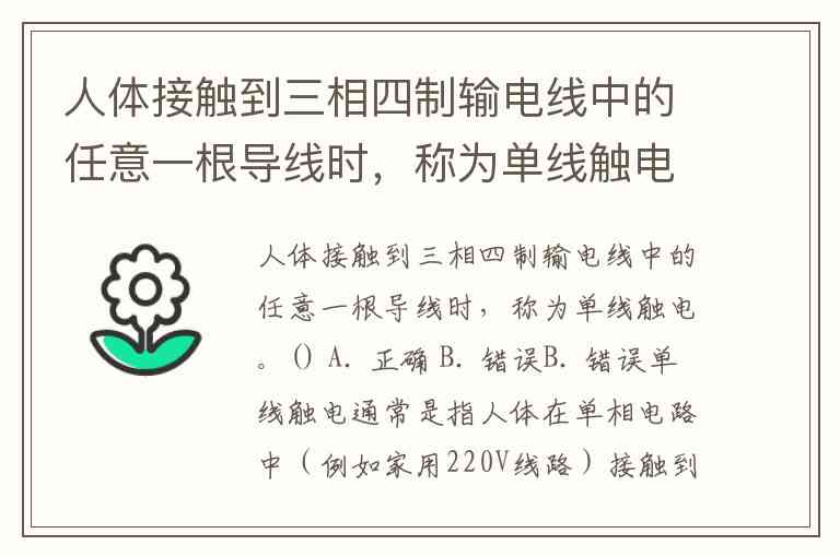 不过在三相系统术语中,更严格的说法是“单相触电”。题目中“单线触电”并非规范术语,且没有强调是否构成回路,如果只是接触一根导线但不形成回路(例如绝缘良好),并不会触电。