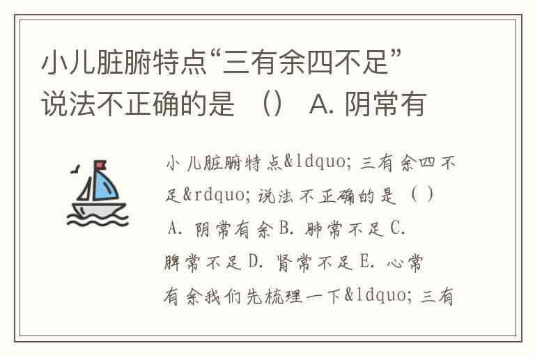 小儿脏腑特点“三有余四不足”说法不正确的是 () A. 阴常有余 B. 肺常不足 C. 脾常不足 D. 肾常不足 E. 心常有余