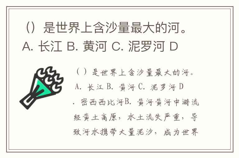 ()是世界上含沙量最大的河。 A. 长江 B. 黄河 C. 泥罗河 D. 密西西比河