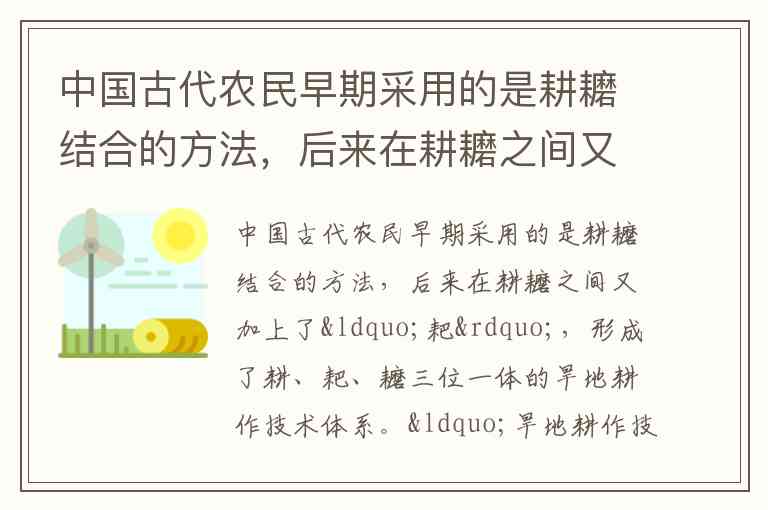 春秋至西汉:主要推行耕耱结合(如“代田法”“区田法”),但“耙”作为碎土整地的专门农具尚未系统整合到技术体系之中。
