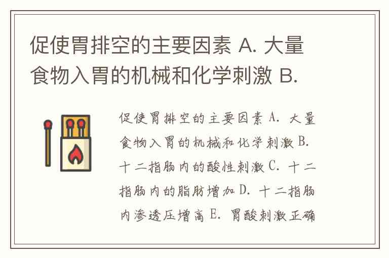 促使胃排空的主要因素 A. 大量食物入胃的机械和化学刺激 B. 十二指肠内的酸性刺激 C. 十二指肠内的脂肪增加 D. 十二指肠内渗透压增高 E. 胃酸刺激