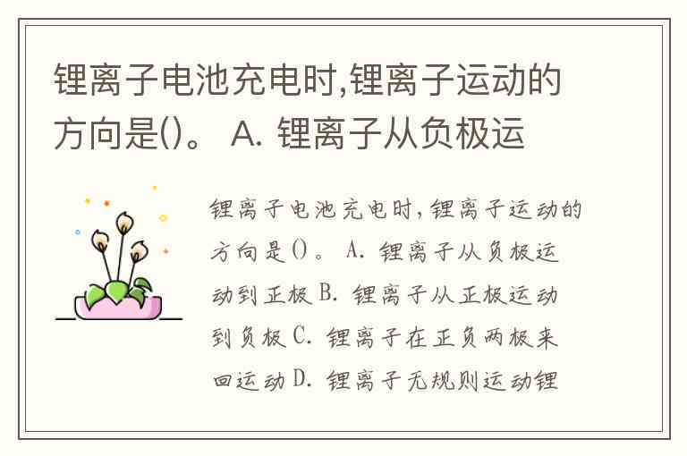 锂离子电池充电时,锂离子运动的方向是()。 A. 锂离子从负极运动到正极 B. 锂离子从正极运动到负极 C. 锂离子在正负两极来回运动 D. 锂离子无规则运动