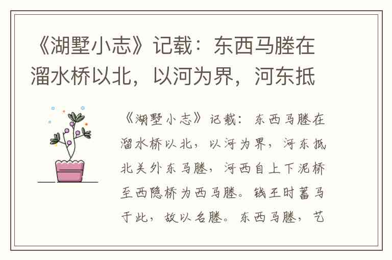 根据《湖墅小志》的记载,东西马塍以艺花闻名,且“堂花”是这里的特色。在“湖墅八景”中,与“花”相关的景致是 “花圃啼莺”。