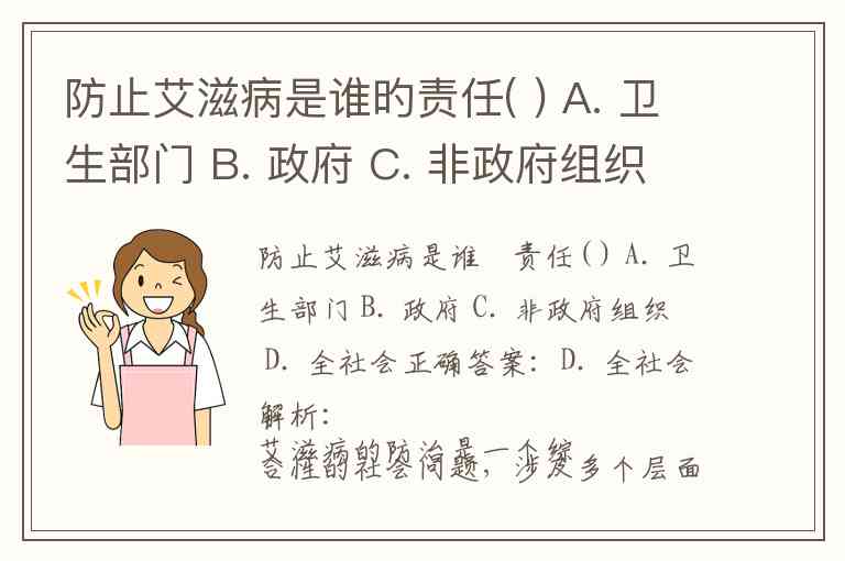 防止艾滋病是谁旳责任( ) A. 卫生部门 B. 政府 C. 非政府组织 D. 全社会