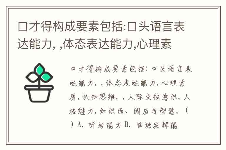 口才得构成要素包括:口头语言表达能力, ,体态表达能力,心理素质,认知思维, ,人际交往意识,人格魅力,知识面、阅历与智慧。( ) A. 听话能力 B. 临场发挥能力 C. 情感表现能力 D. 语言组织能力
