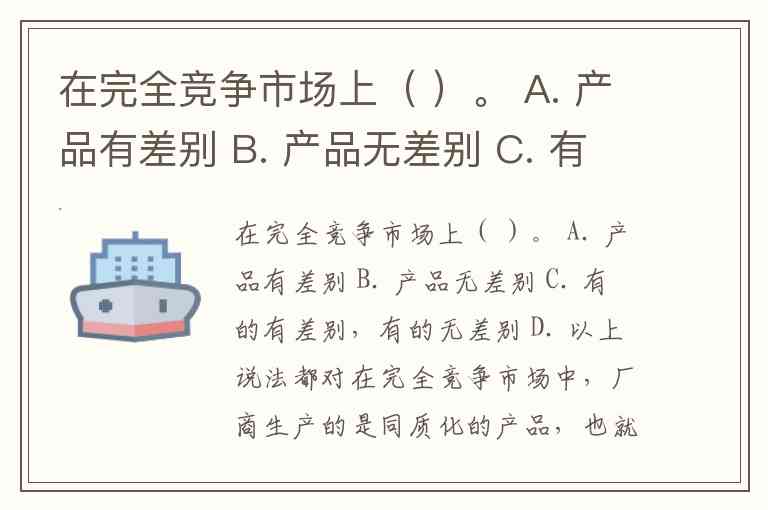 在完全竞争市场上( )。 A. 产品有差别 B. 产品无差别 C. 有的有差别,有的无差别 D. 以上说法都对