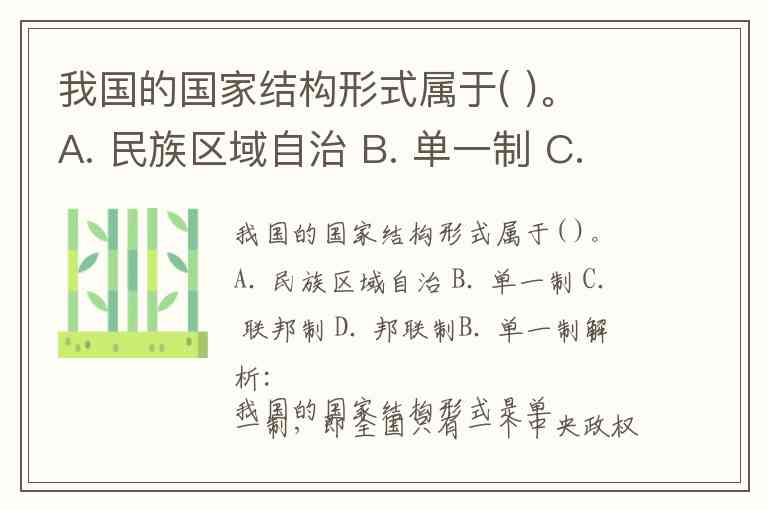 我国的国家结构形式属于( )。 A. 民族区域自治 B. 单一制 C. 联邦制 D. 邦联制