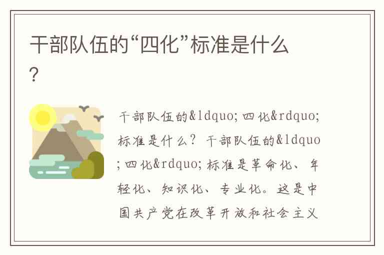 干部队伍的“四化”标准是革命化、年轻化、知识化、专业化。这是中国共产党在改革开放和社会主义现代化建设新时期提出的干部队伍建设的重要指导方针。具体内容如下: