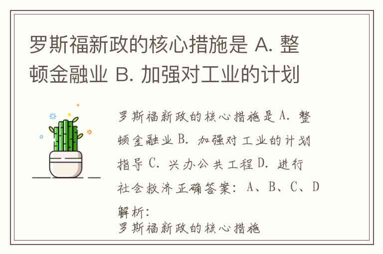 罗斯福新政的核心措施是 A. 整顿金融业 B. 加强对工业的计划指导 C. 兴办公共工程 D. 进行社会救济