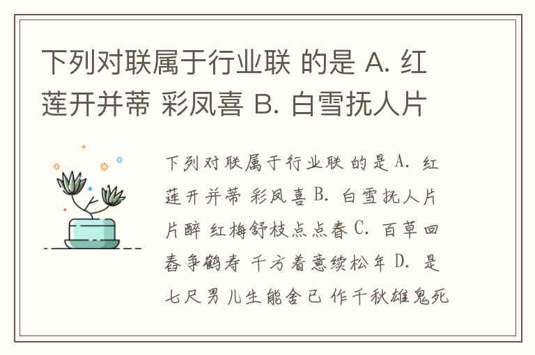 下列对联属于行业联 的是 A. 红莲开并蒂 彩凤喜 B. 白雪抚人片片醉 红梅舒枝点点春 C. 百草回舂争鹤寿 千方着意续松年 D. 是七尺男儿生能舍已 作千秋雄鬼死不还家