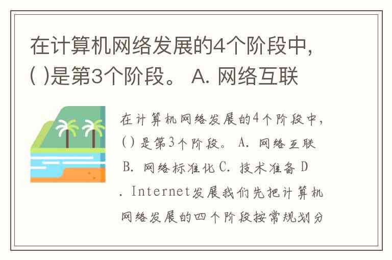 在计算机网络发展的4个阶段中,( )是第3个阶段。 A. 网络互联 B. 网络标准化 C. 技术准备 D. Internet发展