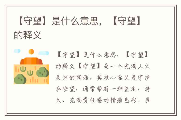 【守望】是一个充满人文关怀的词语,其核心含义是守护和盼望,通常带有一种坚定、持久、充满责任感的情感色彩。