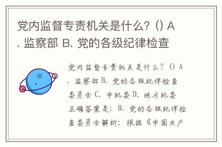 党内监督专责机关是什么?() A. 监察部 B. 党的各级纪律检查委员会 C. 中纪委 D. 地方纪委