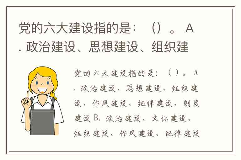 党的六大建设指的是:()。 A. 政治建设、思想建设、组织建设、作风建设、纪律建设,制度建设 B. 政治建设、文化建设、组织建设、作风建设、纪律建设,制度建设 C. 政治建设、思想建设、组织建设、作风建设、纪律建设,群众建设 D. 政治建设、思想建设、组织建设、作风建设、廉政建设,制度建设