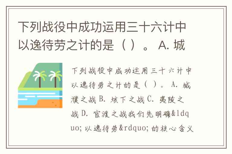 下列战役中成功运用三十六计中以逸待劳之计的是( )。 A. 城濮之战 B. 垓下之战 C. 夷陵之战 D. 官渡之战