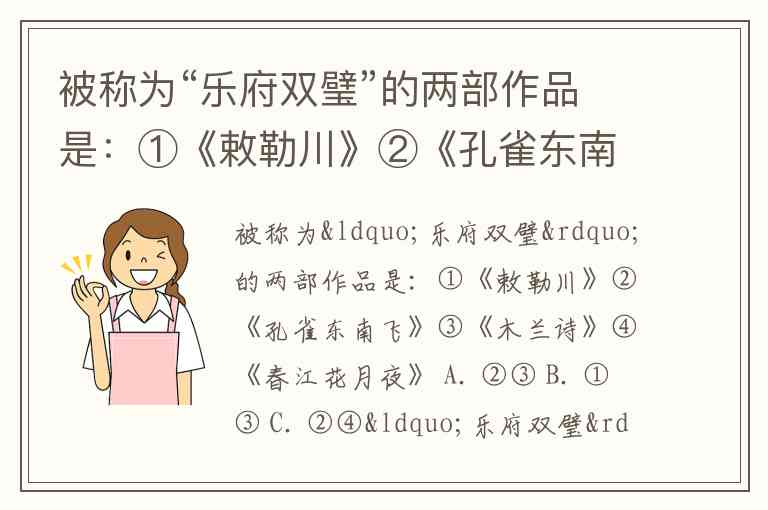被称为“乐府双璧”的两部作品是:①《敕勒川》②《孔雀东南飞》③《木兰诗》④《春江花月夜》 A. ②③ B. ①③ C. ②④