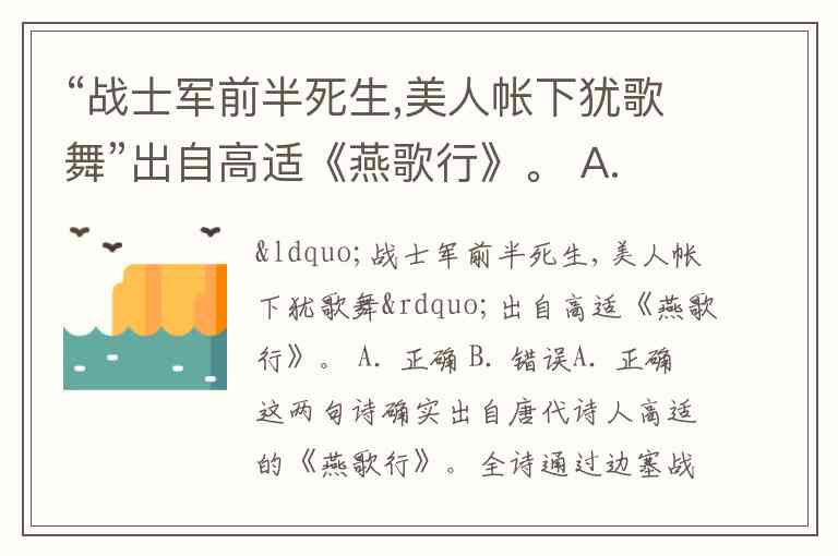 “战士军前半死生,美人帐下犹歌舞”出自高适《燕歌行》。 A. 正确 B. 错误