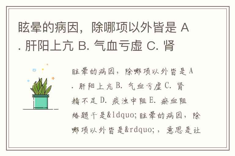 眩晕的病因,除哪项以外皆是 A. 肝阳上亢 B. 气血亏虚 C. 肾精不足 D. 痰浊中阻 E. 瘀血阻络