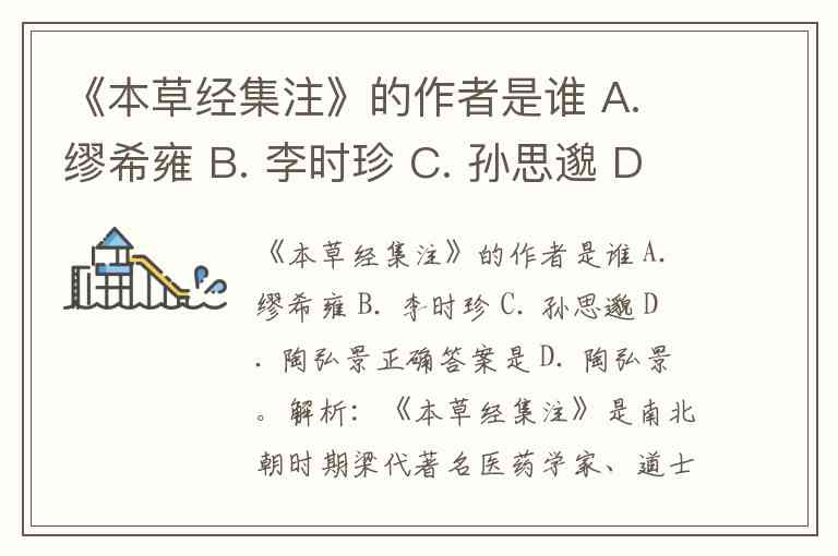 《本草经集注》的作者是谁 A. 缪希雍 B. 李时珍 C. 孙思邈 D. 陶弘景