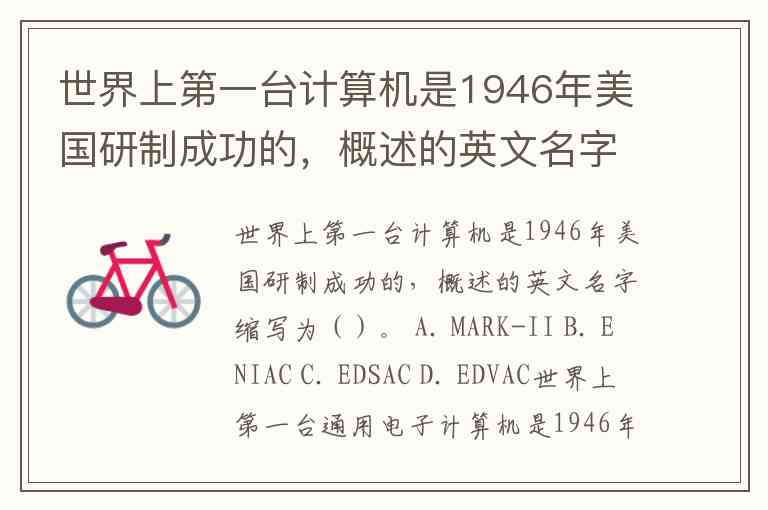 世界上第一台计算机是1946年美国研制成功的,概述的英文名字缩写为()。 A. MARK-II B. ENIAC C. EDSAC D. EDVAC