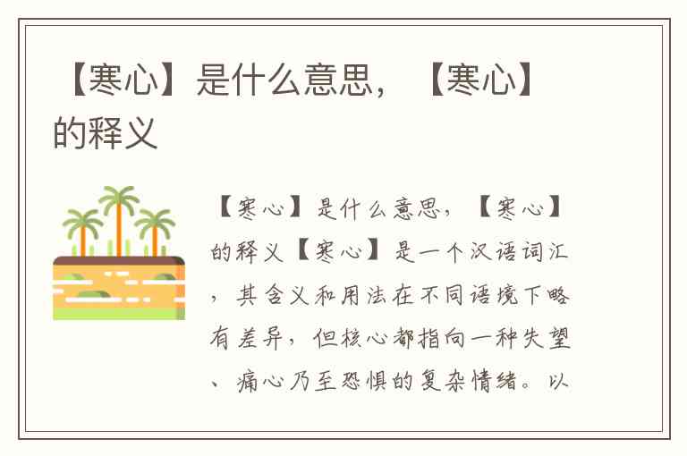 【寒心】是一个汉语词汇,其含义和用法在不同语境下略有差异,但核心都指向一种失望、痛心乃至恐惧的复杂情绪。以下是详细的释义: