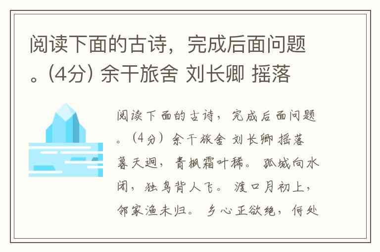 阅读下面的古诗,完成后面问题。(4分) 余干旅舍 刘长卿 摇落暮天迥,青枫霜叶稀。 孤城向水闭,独鸟背人飞。 渡口月初上,邻家渔未归。 乡心正欲绝,何处捣寒衣。 【注释】此诗是刘长卿寄寓在余干(今属江西)旅舍时所写。 小题1:下面对诗中所表现出的作者的心情概括恰当的一项是( )(2分) A.凄清孤寂 B.轻松愉快 C.缠绵悱恻 D.惆怅悲愤 小题2:下面对诗歌的分析不正确一项是( )(2分) A.这首诗开头写诗人独自在旅舍门外伫立凝望,由于草木摇落,整个世界显得清旷疏朗起来。 B.诗人的仕途不顺,命运多舛,其诗作多有政治失意之感。本诗中“独鸟背人飞”也暗喻着诗人的孤苦背时,含蕴着宦途坎坷的深沉感情。 C.从全诗来看,诗人是按照由近到远的顺序来展开描写的。 D.诗人在前三联中的景物描写,已将乡情旅思写足,尾联翻出新境,把诗情又推进一层。诗人捕捉“捣寒衣”的砧声入诗,更加真切感人地抒写了他满怀的悲愁痛苦。
