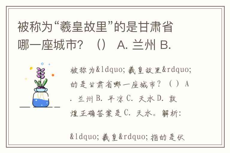 解析:“羲皇”指的是伏羲,是中华民族的人文始祖之一。根据历史传说和文献记载,天水被认为是伏羲的诞生地和伏羲文化的发祥地,因此享有“羲皇故里”的美誉。