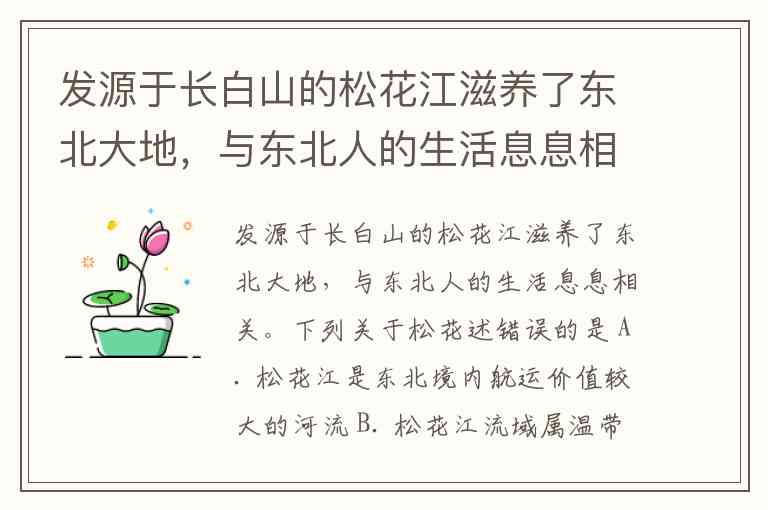 发源于长白山的松花江滋养了东北大地,与东北人的生活息息相关。下列关于松花述错误的是 A. 松花江是东北境内航运价值较大的河流 B. 松花江流域属温带大陆性季风气候 C. 松花江是中国黑龙江最小的支流 D. 吉林市位于松花江沿岸